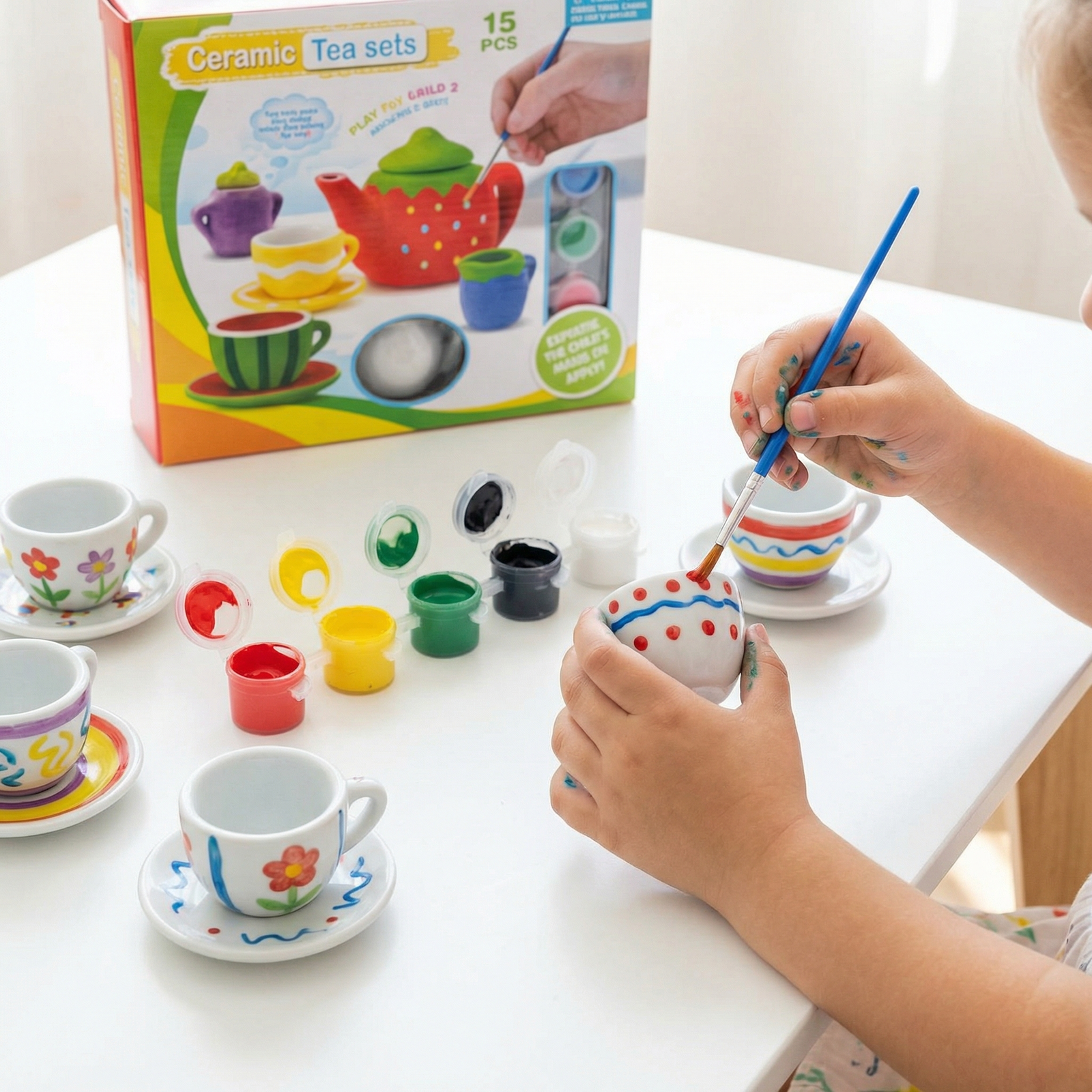 A creative ceramic tea set that kids can paint and decorate, combining art with imaginative play.