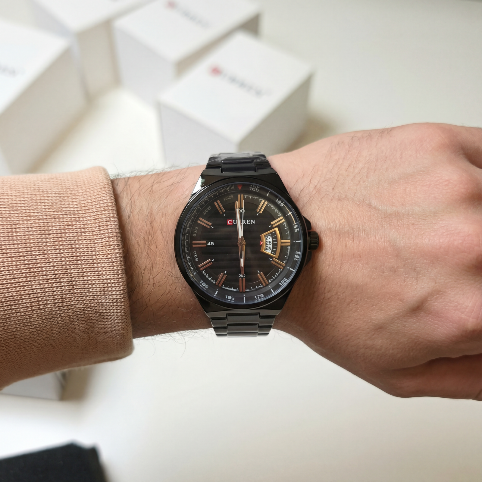 Bold black stainless steel watch with rose-gold accents, sporty dial design, date display, and a powerful modern aesthetic.