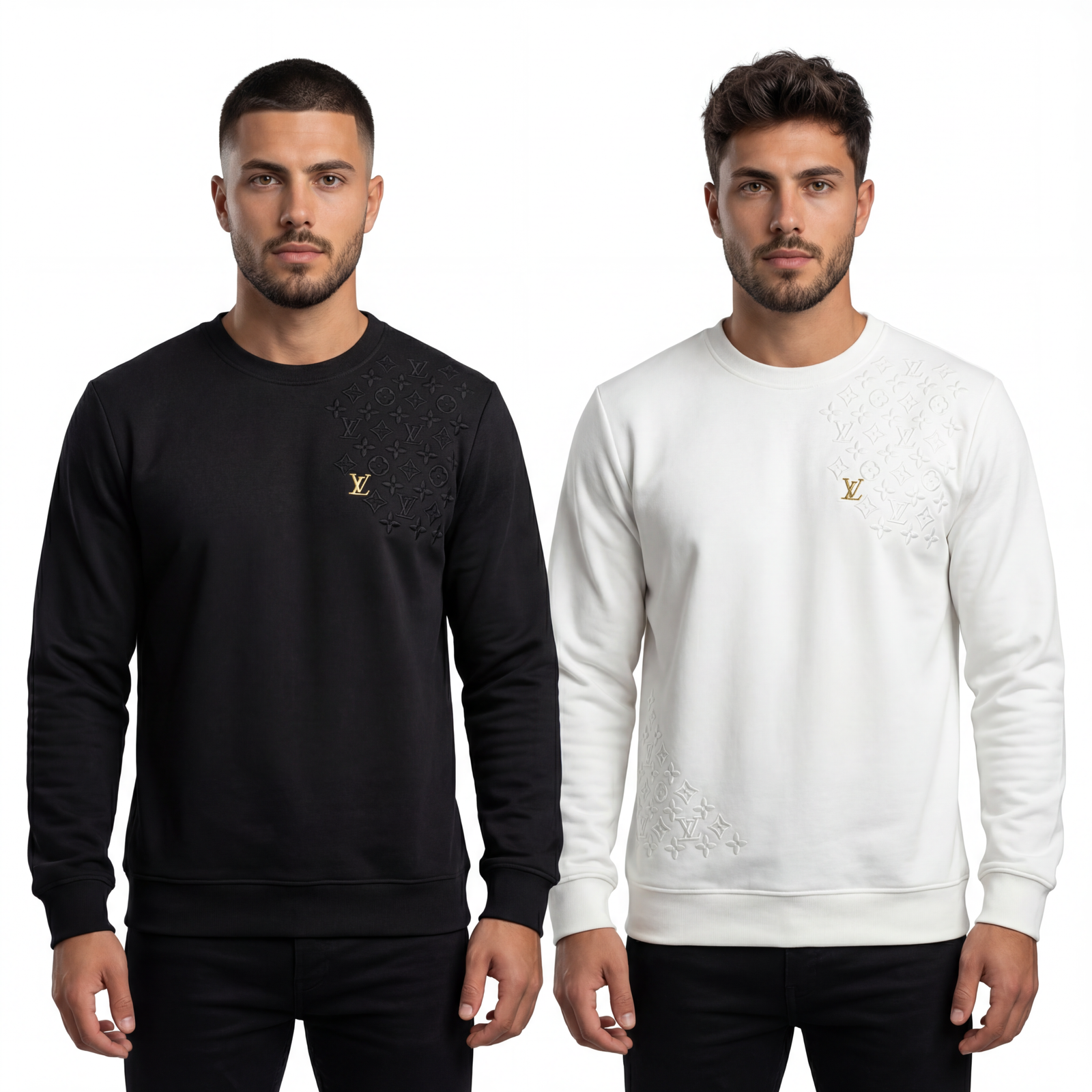 Crewneck sweatshirt with embossed monogram-style detailing and a subtle accent for a premium finish. Clean silhouette with standout texture. Available in black or white.