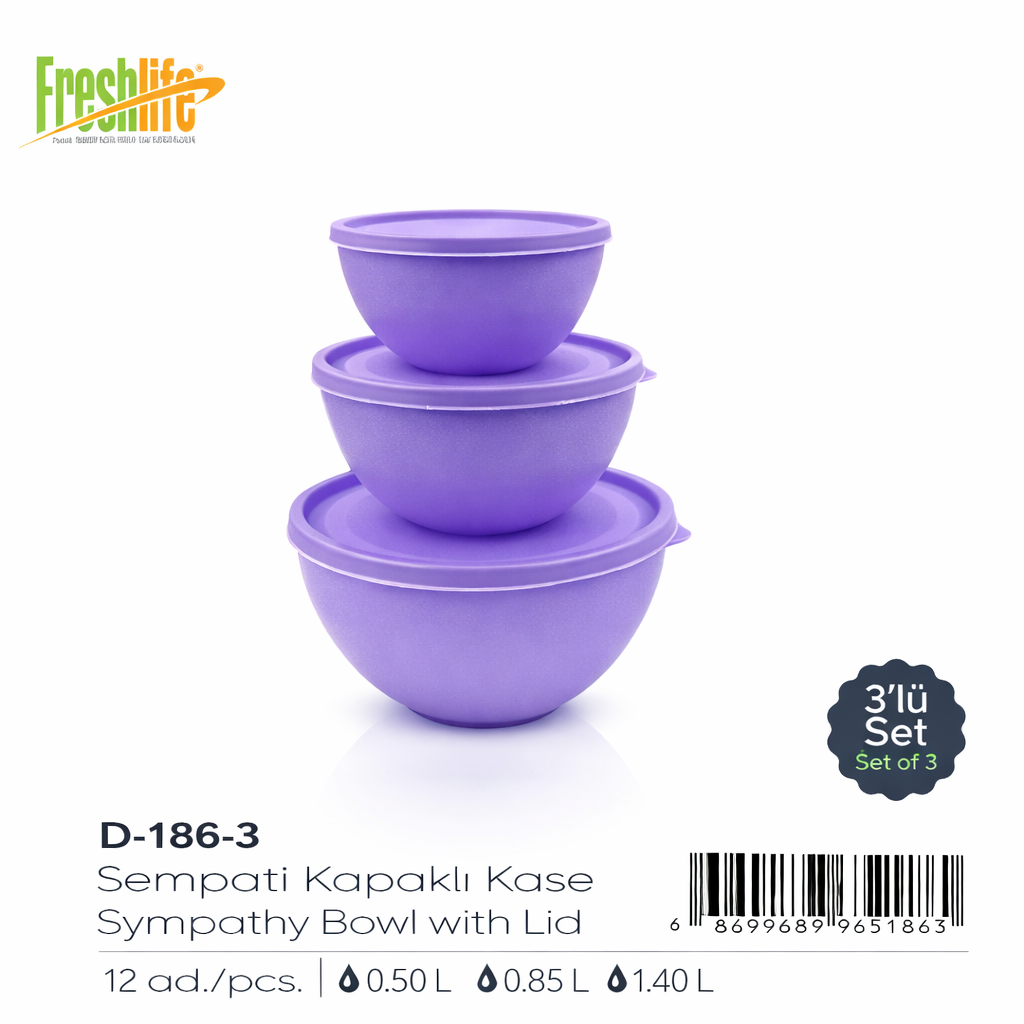 The FreshLife Sympathy Bowl Set includes three bowls with secure lids for convenient food storage. Each bowl is designed with a comfortable shape and practical capacity. Ideal for storing leftovers, mixing ingredients, or serving meals. Durable plastic construction ensures long-lasting performance. A versatile set suitable for everyday kitchen needs.