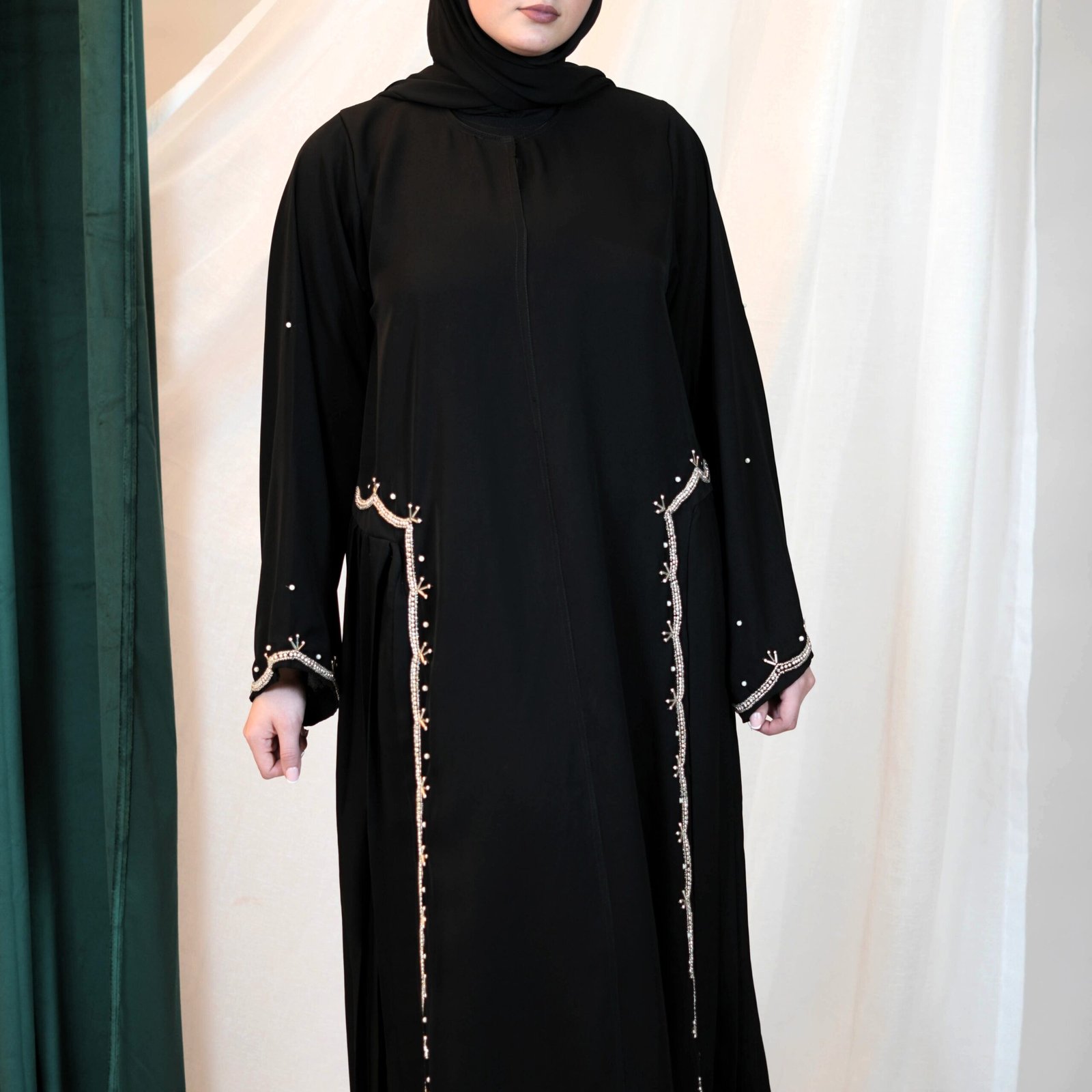 The Golden Accent Abaya is a sophisticated piece designed to stand out gracefully. Delicate golden trims add warmth and refinement to the classic black fabric. Its flowing cut ensures ease of movement and comfort throughout the day. Perfect for formal gatherings, celebrations, or evening events. A timeless piece that combines modesty with luxury.