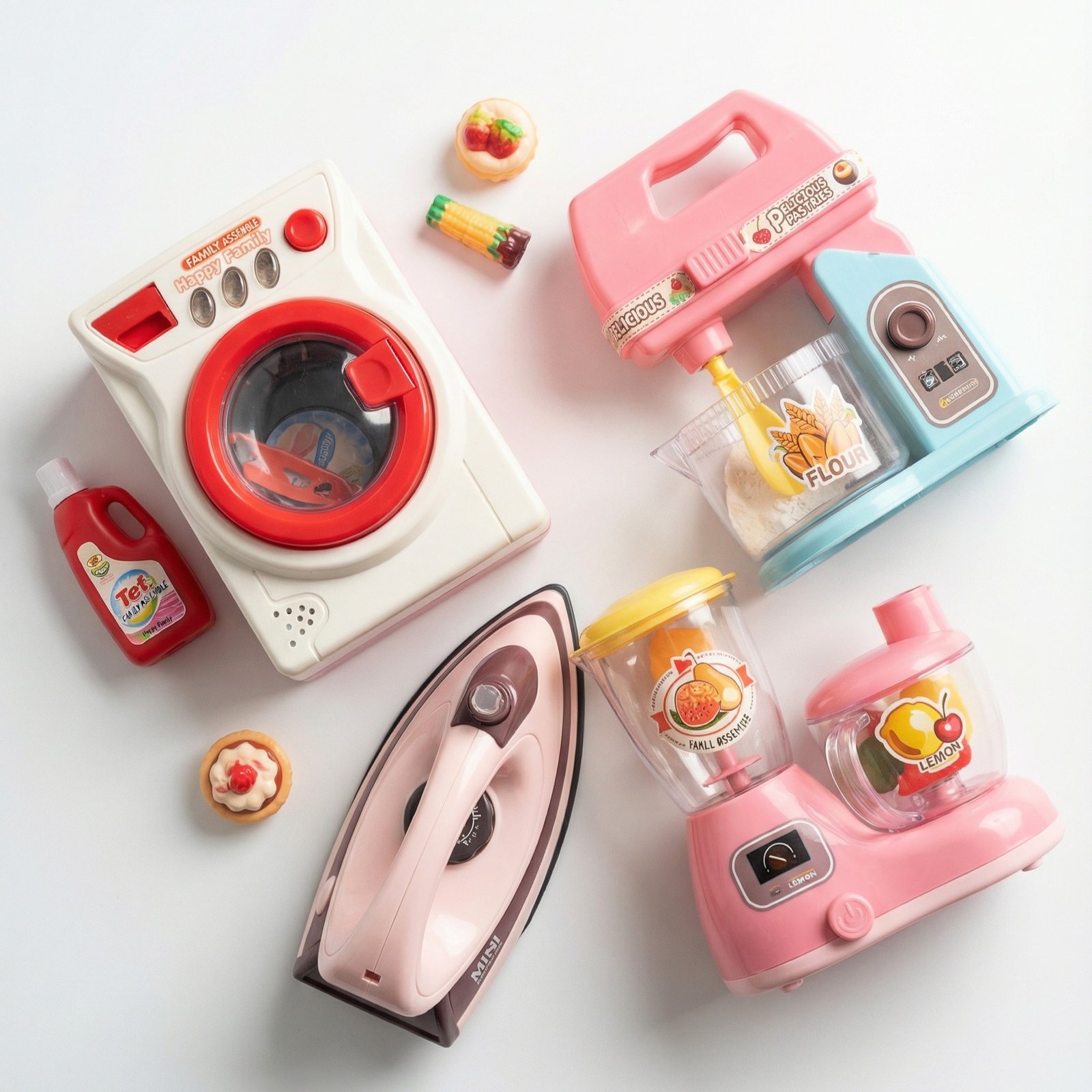 Complete kids’ pretend play appliance set including iron, washing machine, and kitchen mixer bundle.