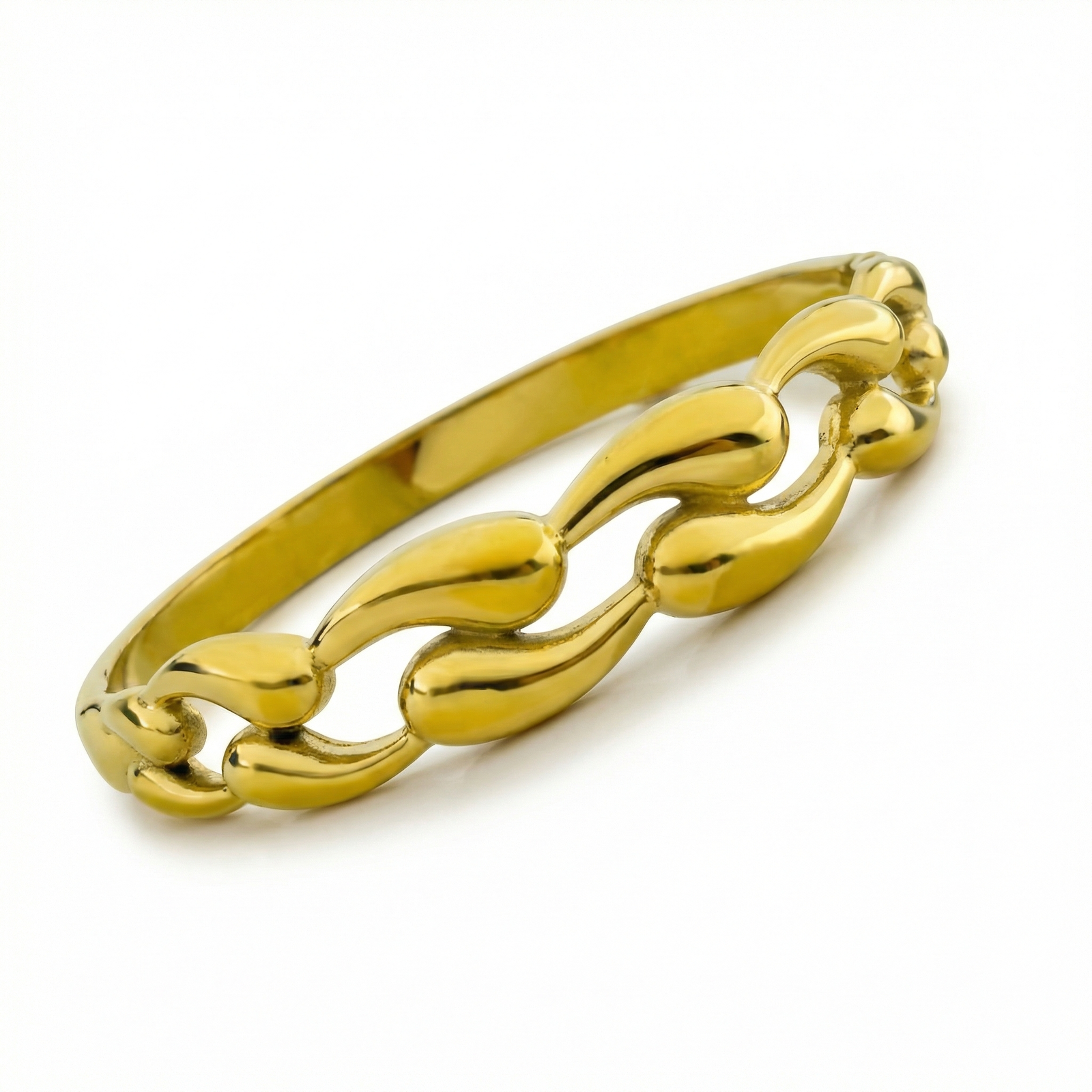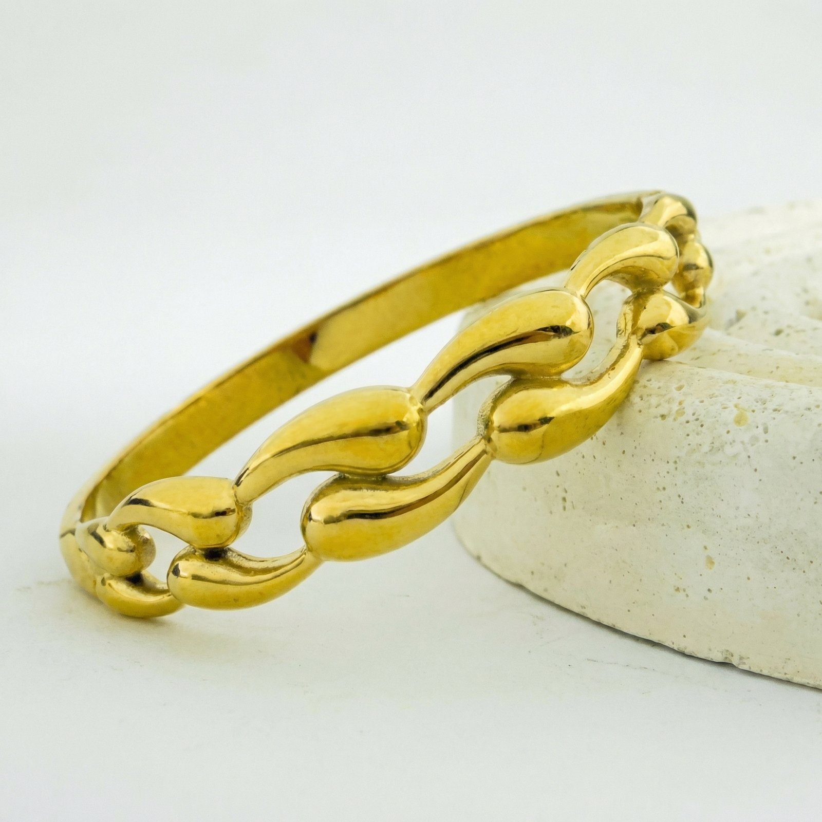 A stylish bangle inspired by classic chain motifs, crafted in a smooth gold-tone finish. The interlinked design adds depth and character while keeping a minimal profile. Comfortable and adjustable for daily wear, it brings a modern edge to any outfit. Ideal for both casual and dressy looks.