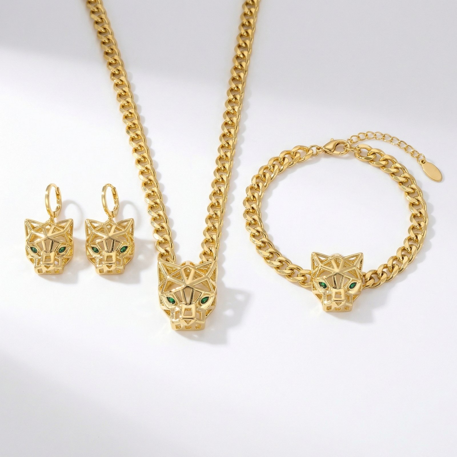Gold-tone jewelry set featuring bold panther design.