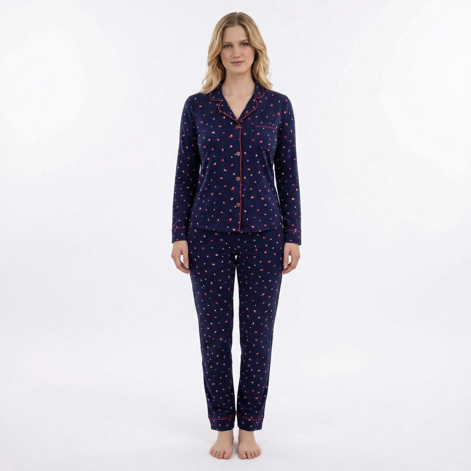 Classic navy pajama set with delicate heart print. Cozy and stylish for nightwear.