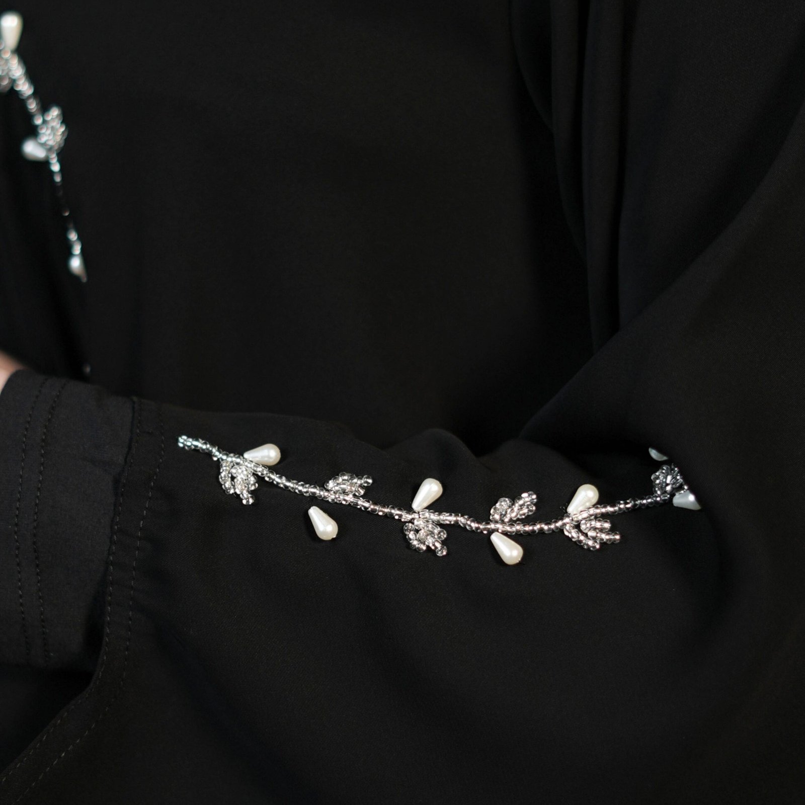 Abaya with elegant vine-style embellishments. Adds a soft feminine touch to classic black.