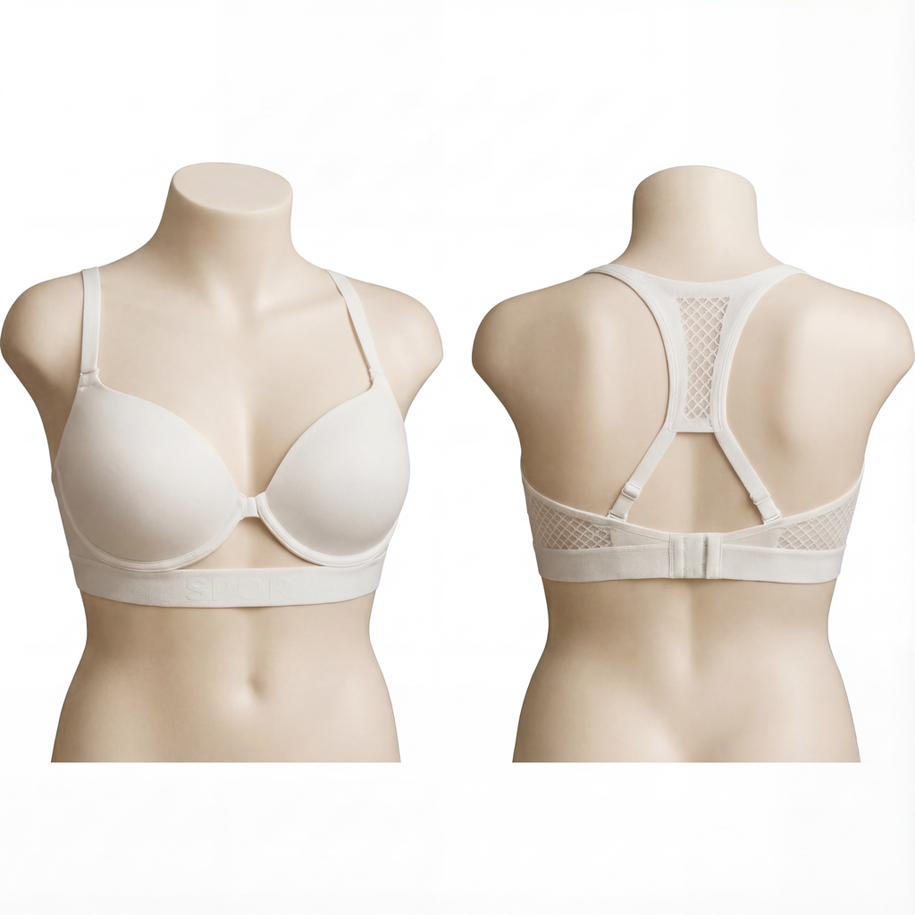 Supportive racerback bra with breathable mesh details, designed for comfort and active movement.
