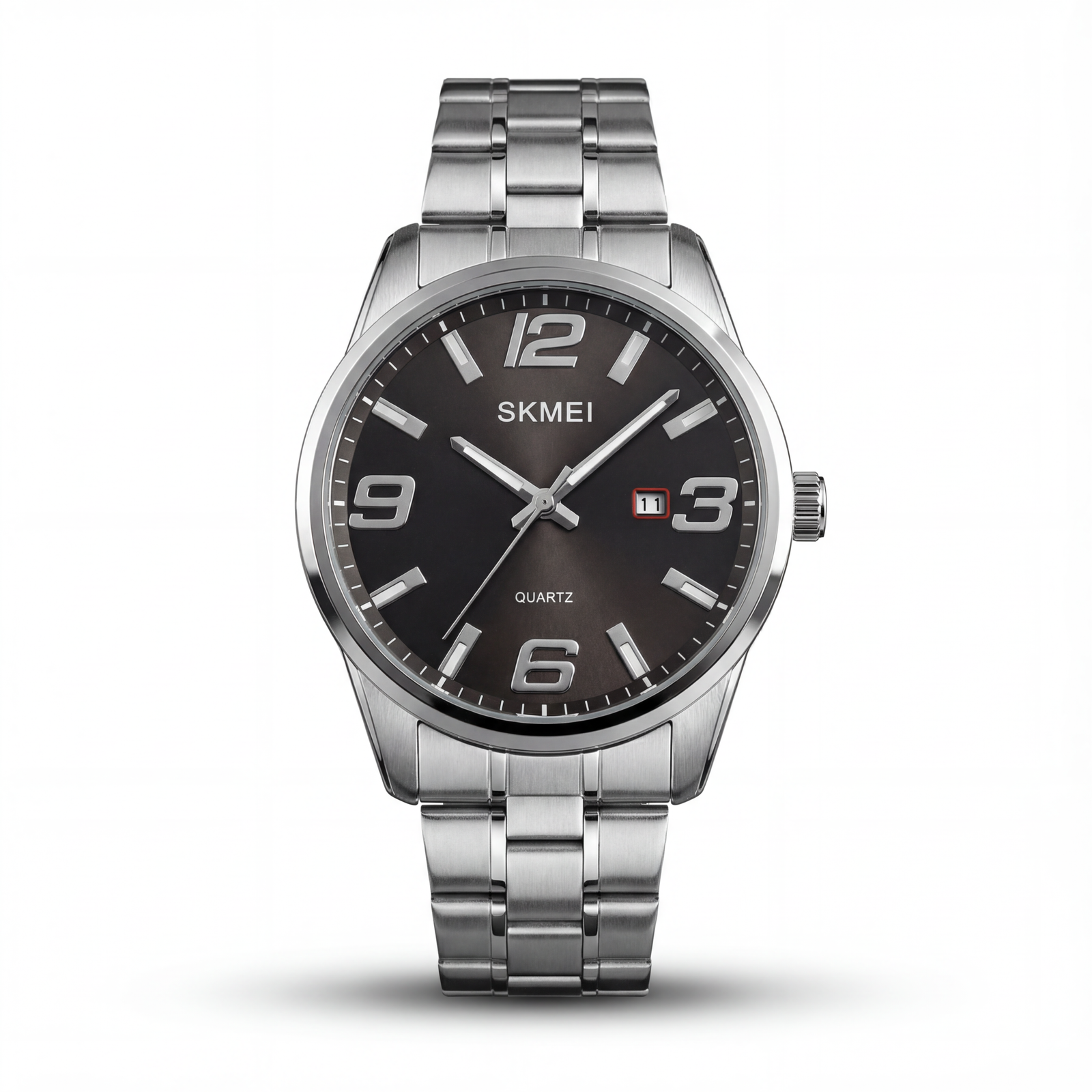 Elegant silver stainless steel watch with a clean black dial, large numeric markers, and precise quartz movement. Perfect for everyday wear and formal occasions.