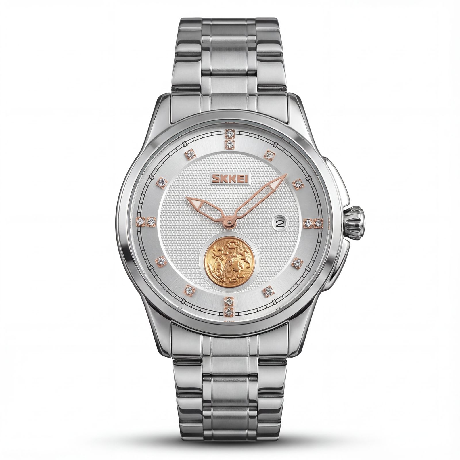 Refined silver stainless steel watch with decorative dial elements, date window, elegant rose-gold hands, and timeless craftsmanship.