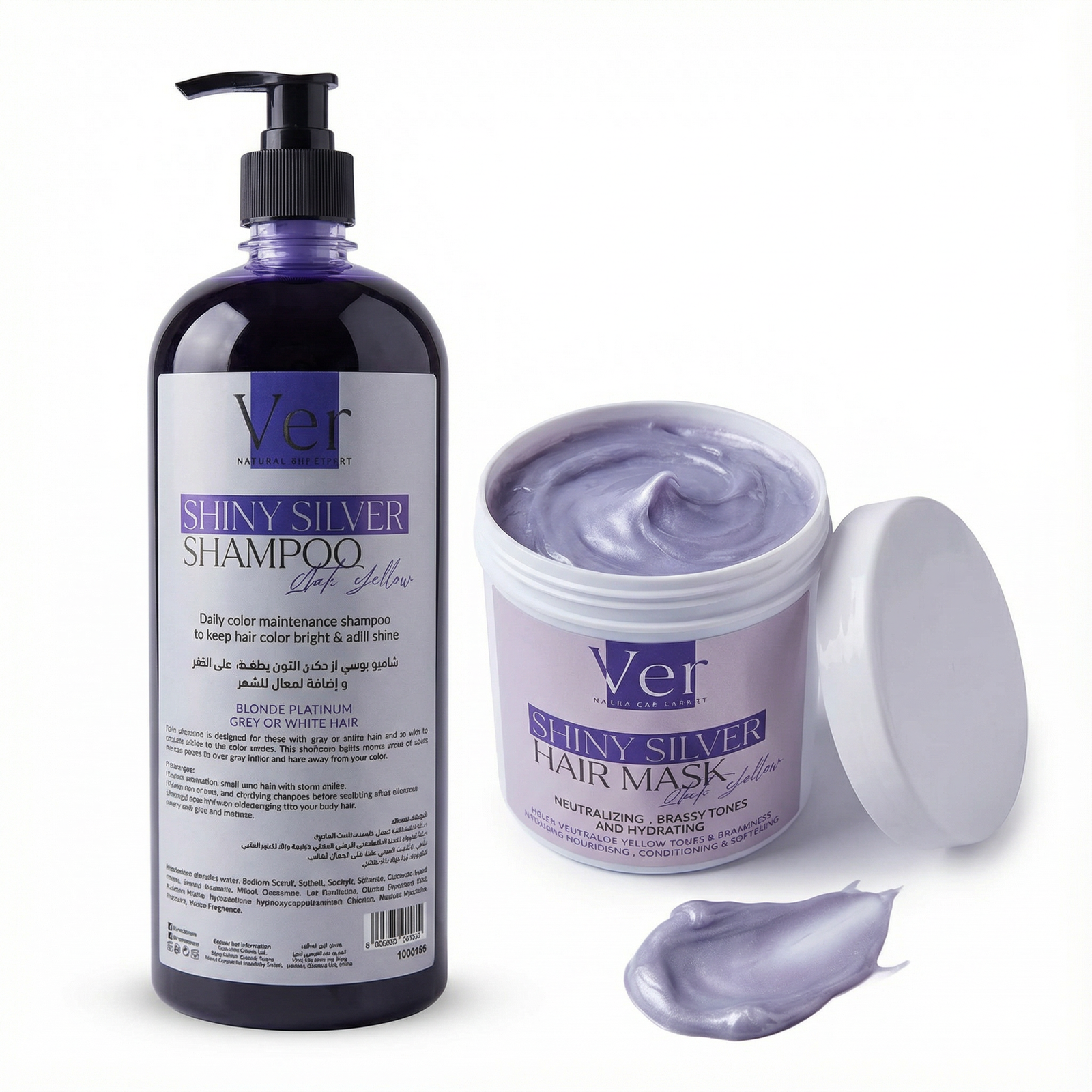 Complete professional set including silver shampoo and hair mask designed to neutralize yellow tones, enhance shine, and deeply nourish blonde, platinum, grey, and white hair while maintaining vibrant color and softness.