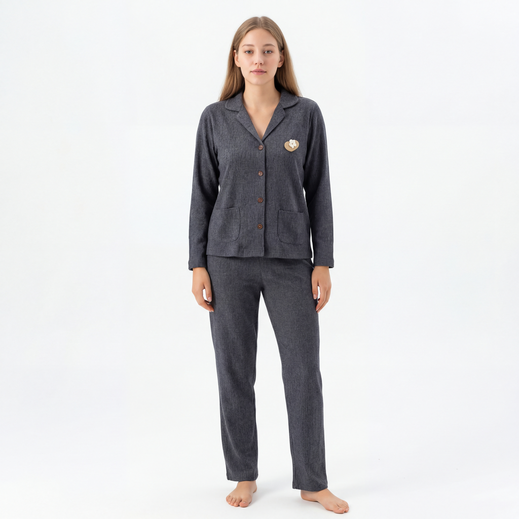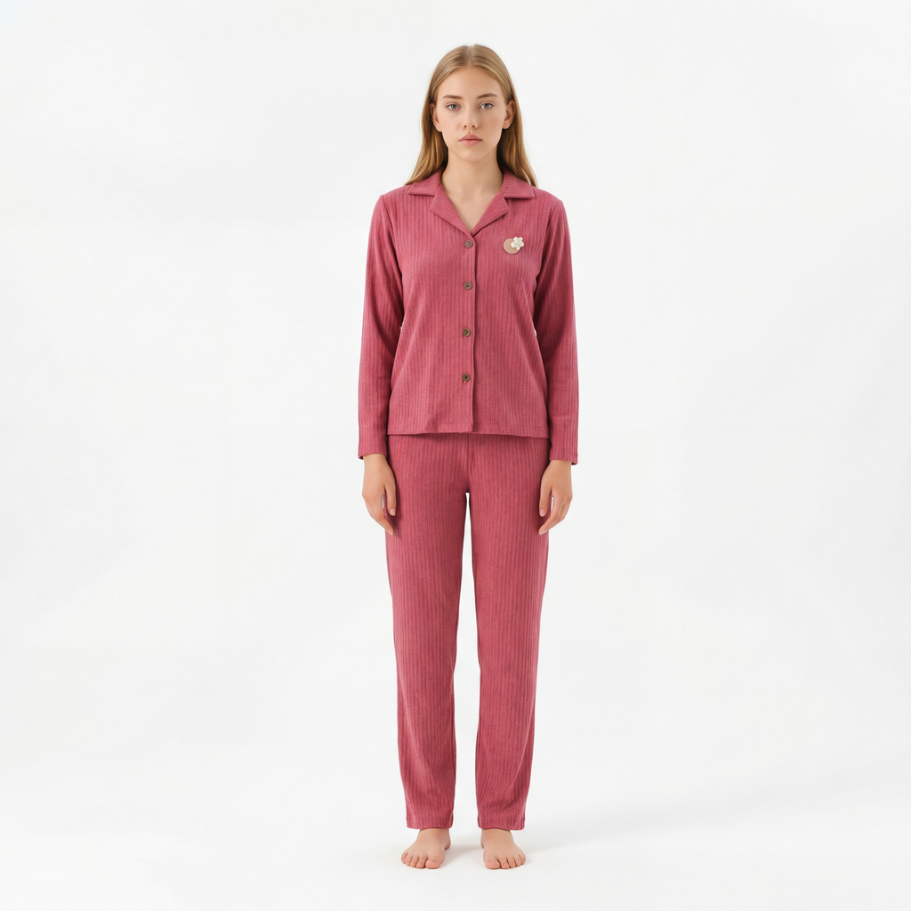Elegant ribbed pajama set in soft pink, designed with a button-up top and matching pants for everyday comfort.